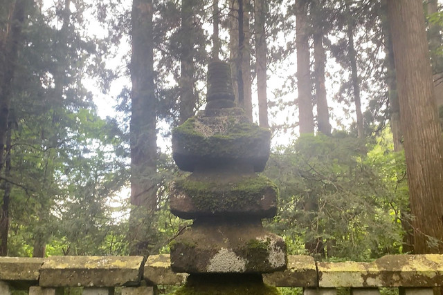 1574年(天正2年)の一向一揆の時に拝殿は焼失し、この石塔も一部失われましたが、1668年(寛文8年)に福井藩主松平光通の奉納により補修して周囲に玉垣をもうけました。平泉寺白山神社HPより引用