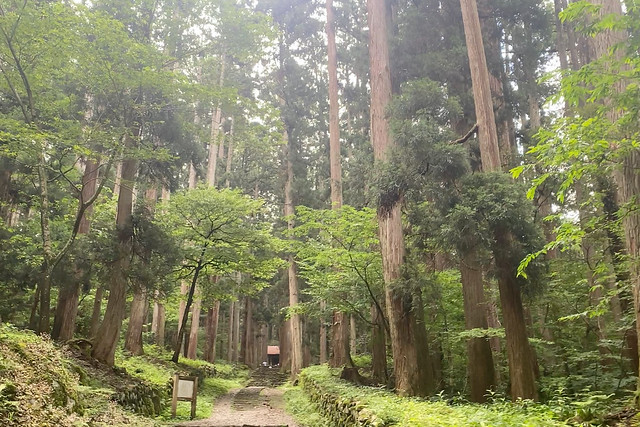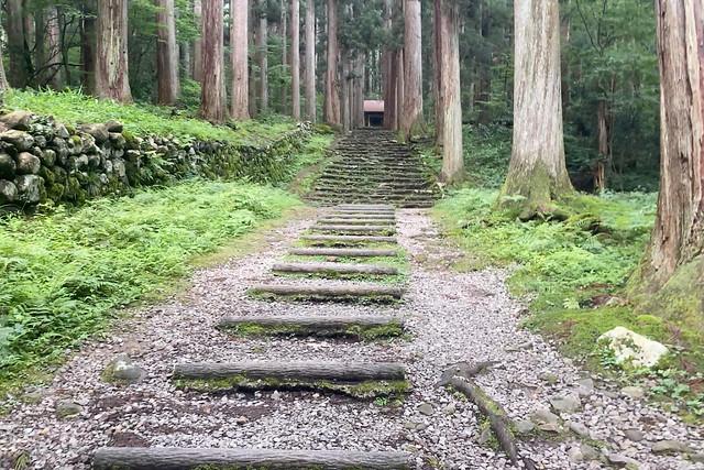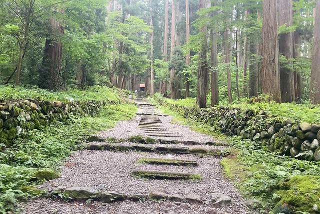 杉の木立に囲まれて、左右に古い石垣が続く道を進んで参ります。