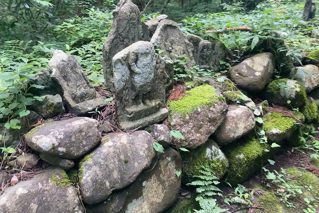 納経所に続く道の左右には古びた石垣らしきものがあるように見えますが、よくみてみると石垣に混じって破壊された石仏が無造作に放置されています。