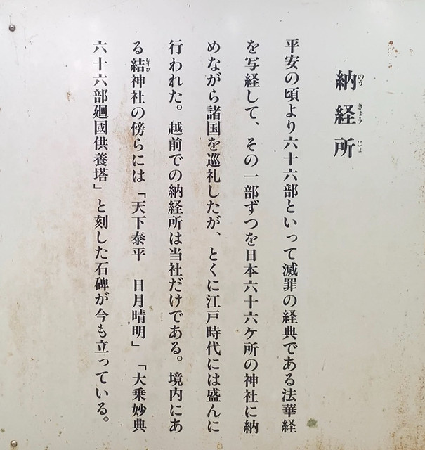 境内にある結神社の傍らには「天下泰平 日月晴明」「大乗妙典六十六部廻國供養塔」と刻した石碑が現存しています。平泉寺白山神社HPより引用