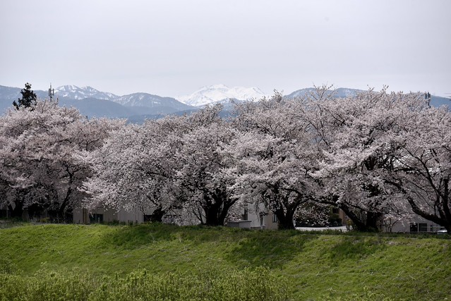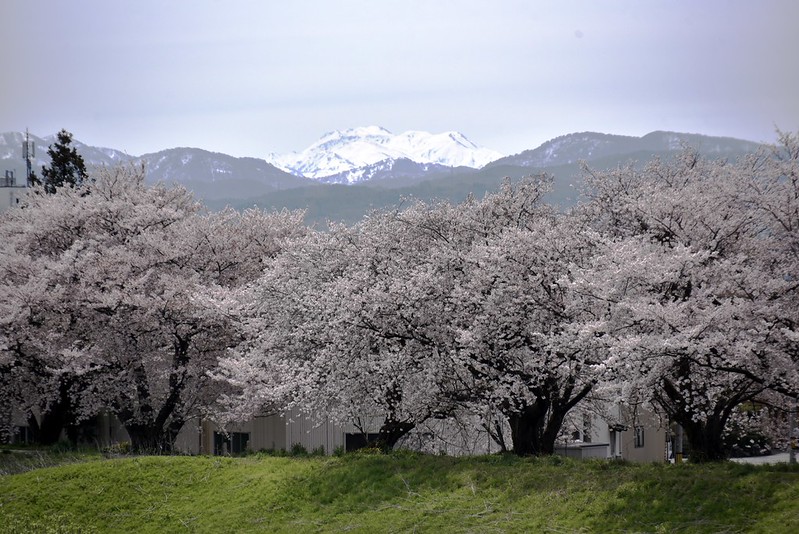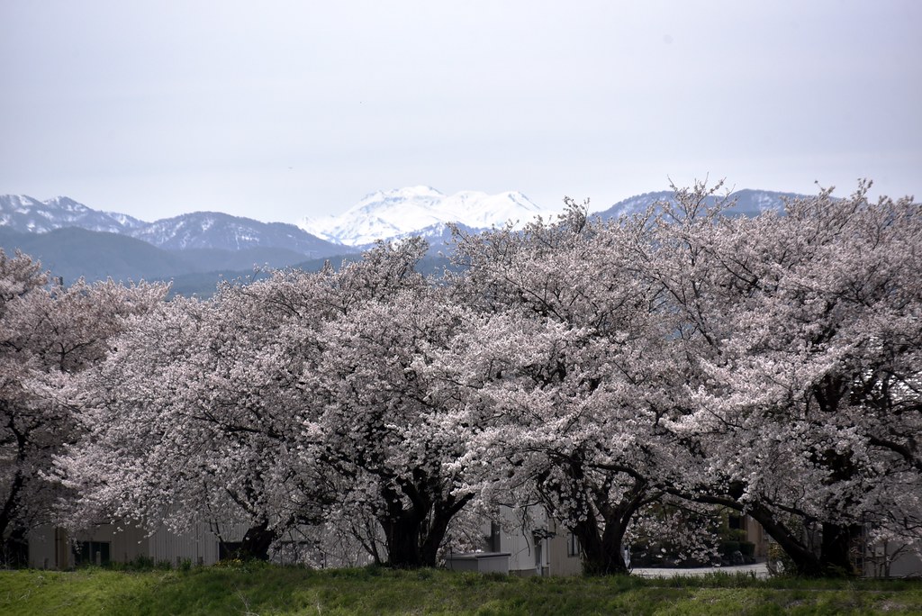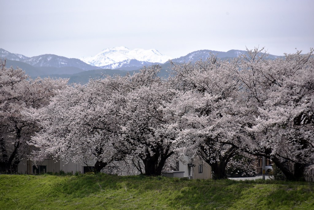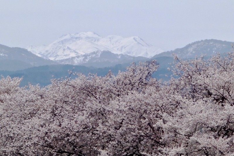 白山と桜のコラボですけど、ちょうど満開の時期に一度車を走らせましたが、快晴の青空なのに白山連峰は全く姿を表さず撃沈しました。